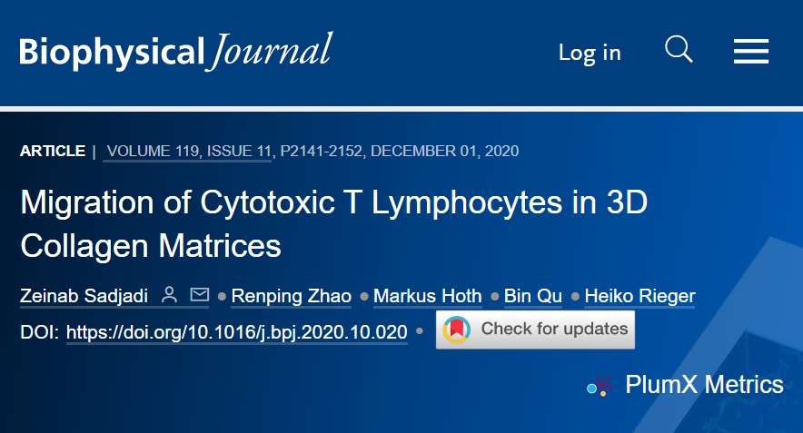 [1]Migration of cytotoxic T Lymphocytes in 3D collagen matrices.https://doi.org/10.1016/j.bpj.2020.10.020.