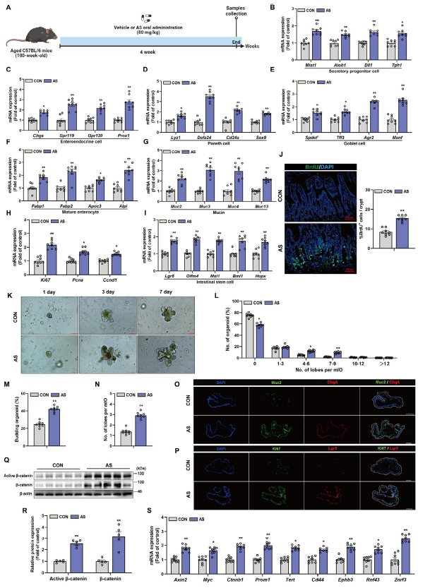 为进一步验证,研究人员从两组小鼠肠道分手细胞培育类器官,发现紫花苜蓿皂苷处置组的类器官分支更复杂,芽生类器官比例和平均叶数显著晋升,类器官中Muc2、ChgA、Ki67、Lgr5这些要害卵白的表达也更多。另外,紫花苜蓿皂苷还能提高衰长幼鼠肠道中β-连环卵白与活性β-连环卵白的卵白程度,激活保持肠道干细胞功能的焦点通路——Wnt旌旗灯号通路的靶基因表达。