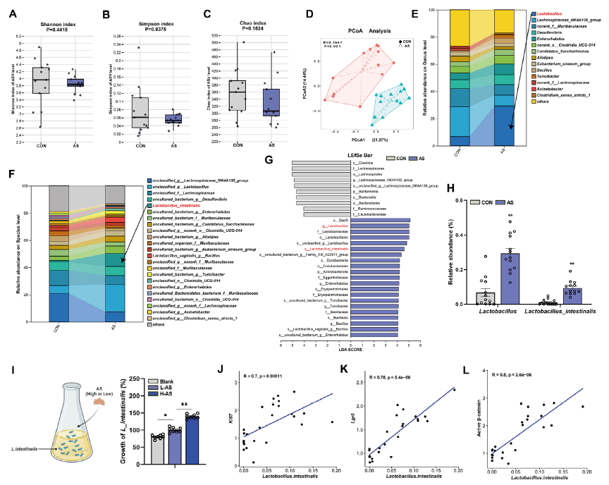 既然紫花苜蓿皂苷能改良肠道功能,研究团队又探讨了它与肠道菌群的联系关系,经由过程16S rRNA测序发现,紫花苜蓿皂苷处置没有改变小鼠肠道菌群的α多样性(菌群丰硕度和平均度),但β多样性(菌群整体构成)呈现显著分手,申明菌群布局产生较着转变。进一步阐发显示,乳杆菌属的品貌显著升高,此中肠道乳杆菌的增添最为凸起。体外共培育尝试也证实,紫花苜蓿皂苷能作为肠道乳杆菌的碳源增进其发展,且肠道乳杆菌品貌与Ki67、Lgr5的表达量和活性β-连环卵白程度呈较着正相干。