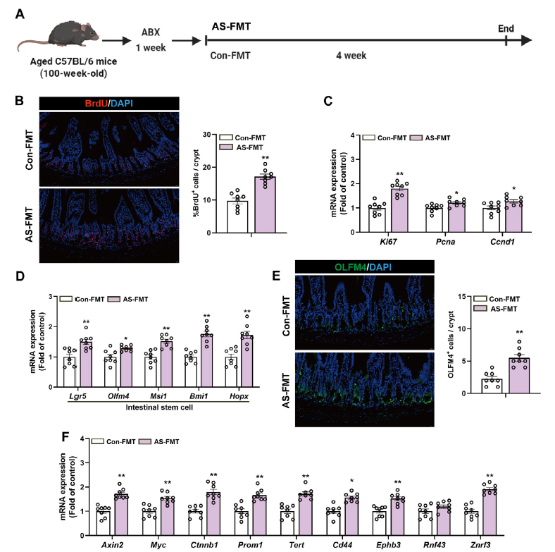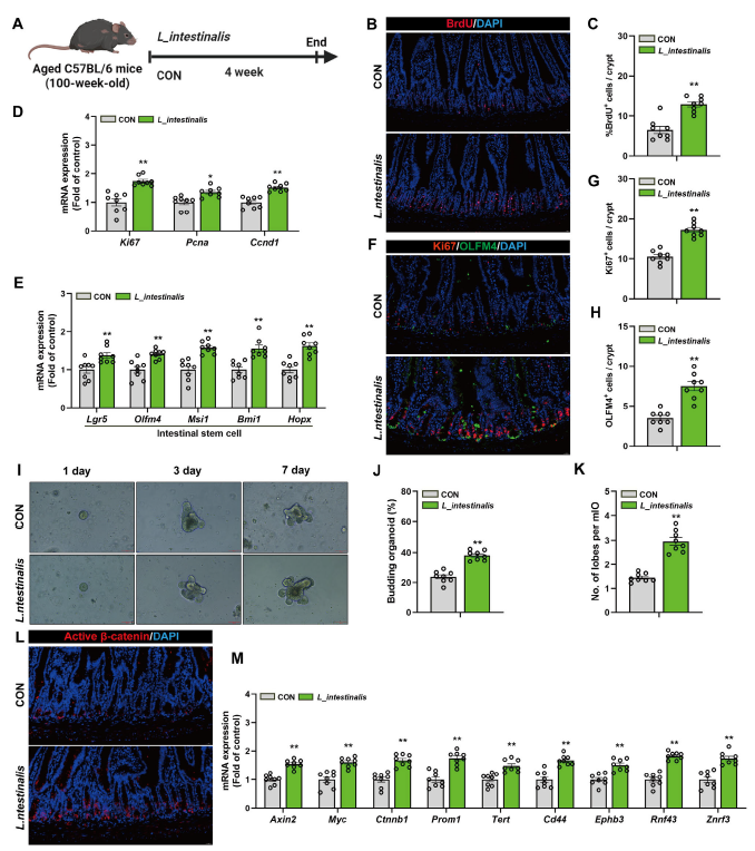 既然肠道乳杆菌是要害菌群,研究团队直接给衰长幼鼠灌胃肠道乳杆菌,想不雅察其直接感化。成果显示,小鼠肠道隐窝BrdU阳性细胞数显著增添,增殖与干细胞标记物表达上调,肠道类器官分支能力加强,Wnt旌旗灯号通路也被成功激活。这申明肠道乳杆菌无需依靠其他身分,就可以直接增进衰长幼鼠肠道干细胞的增殖与分化。