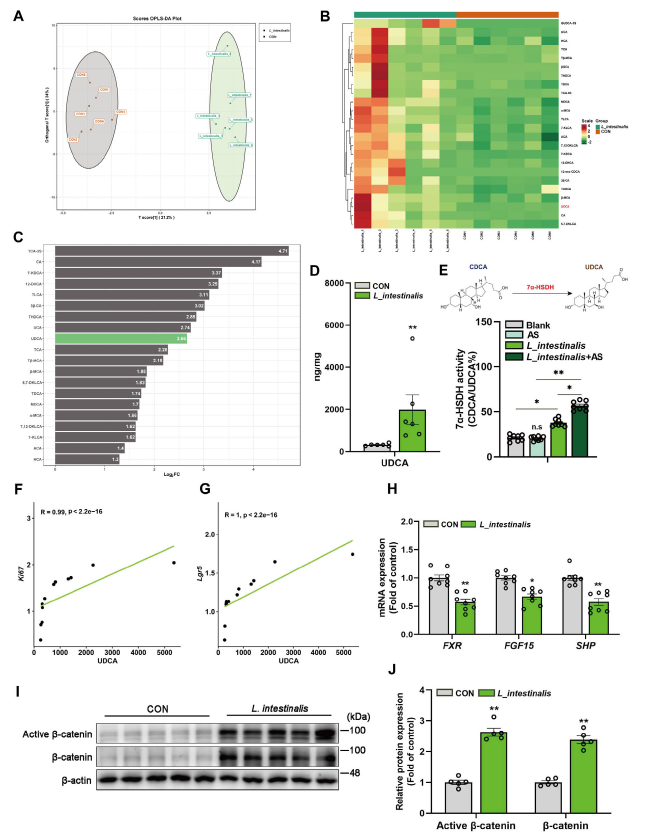 接下来,研究团队进一步寻觅肠道乳杆菌阐扬感化的“中心信使”。经由过程靶向胆汁酸代谢阐发发现,肠道乳杆菌处置组小鼠粪便中,熊去氧胆酸的程度显著升高。体外尝试证实,肠道乳杆菌能经由过程发生7α-羟基类固醇脱氢酶,将鹅去氧胆酸转化为熊去氧胆酸;若将紫花苜蓿皂苷与肠道乳杆菌共培育,还能进一步加强这类酶的活性,晋升熊去氧胆酸产量。并且熊去氧胆酸程度与Ki67、Lgr5的表达量呈极强正相干,申明它与肠道细胞增殖、干细胞功能紧密亲密相干。